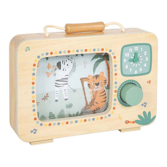 Boîte à musique Télévision en bois Safari est un jouet nostalgique magique qui invite les enfants à regarder, écouter, tourner et découvrir. Tandis que le paysage Safari défile doucement, cette télévision en bois stimule leurs sens et soutient le développement par le jeu. Une pièce décorative magnifique et un ajout précieux au jeu sensoriel.
